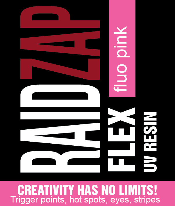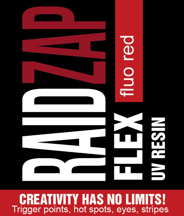 Create stripes, hot spots, flex eyes, flex surface, create what you like with the Raidzap Flex Colors. The colours will glow with a UV light in the dark. 3 times more fluorescence is added to these colours.